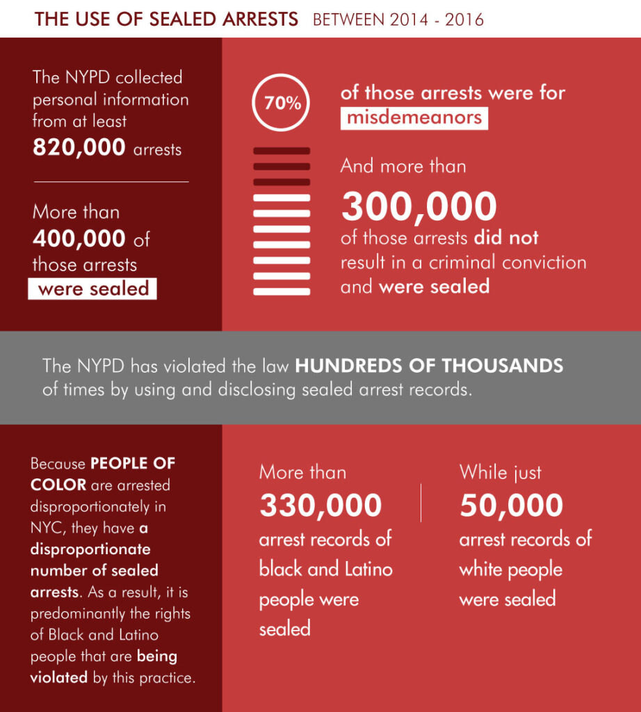 The NYPD collects massive amounts of data about every person it has arrested and it maintains a network of databases that store and disseminate the arrest information it collects. Arrest records can contain sensitive information including names, photographs, addresses, arrest charges, Social Security numbers, fingerprints, and contact information for the person arrested, as well as information about that person’s relatives and acquaintances. In the last four years, the NYPD effected over 1 million arrests; as a result, over 1 million records filled with personal information were uploaded into NYPD databases. Between 2014 and 2016, the NYPD collected personal information from at least 820,000 total arrests and more than 400,000 of those are arrests that should be sealed.